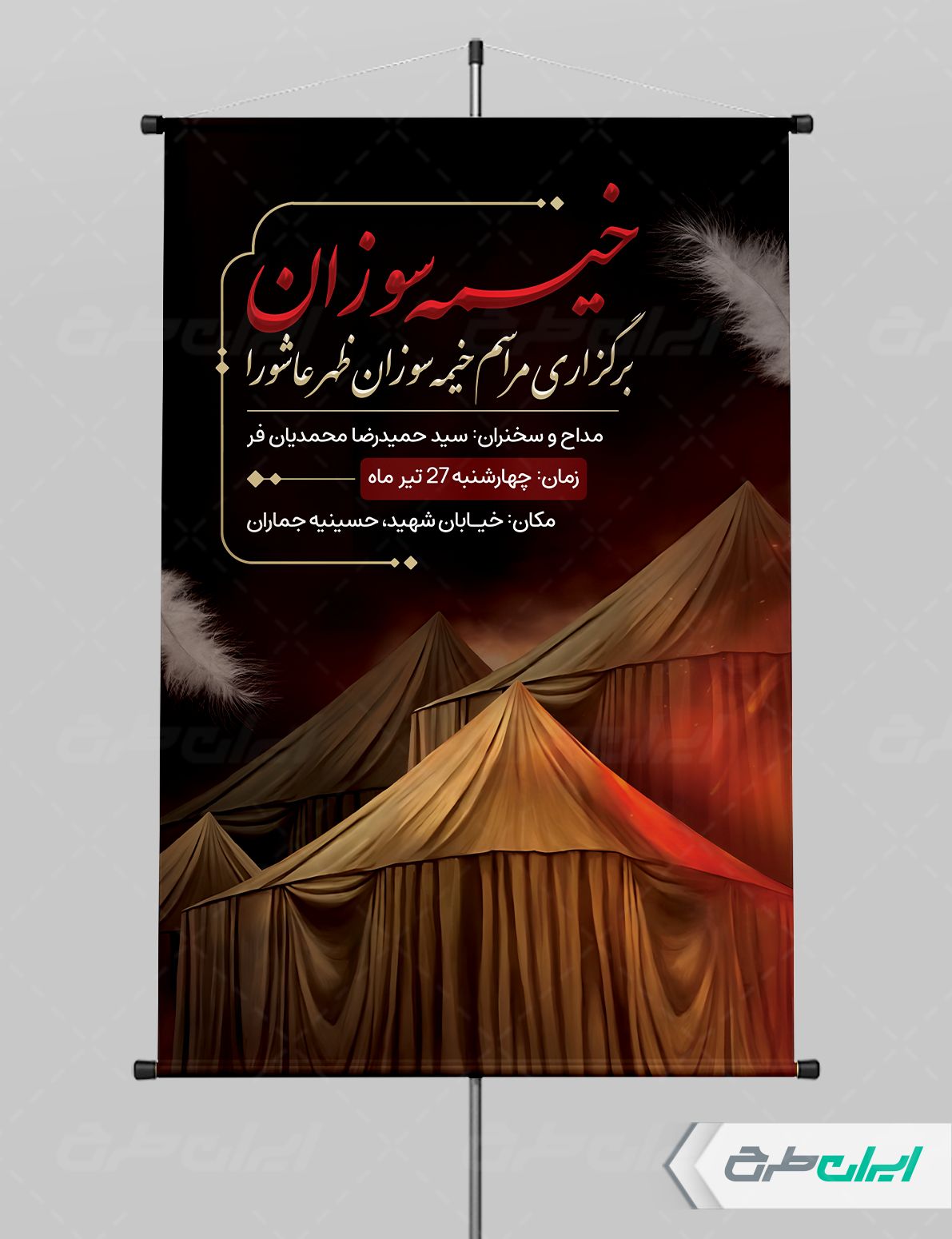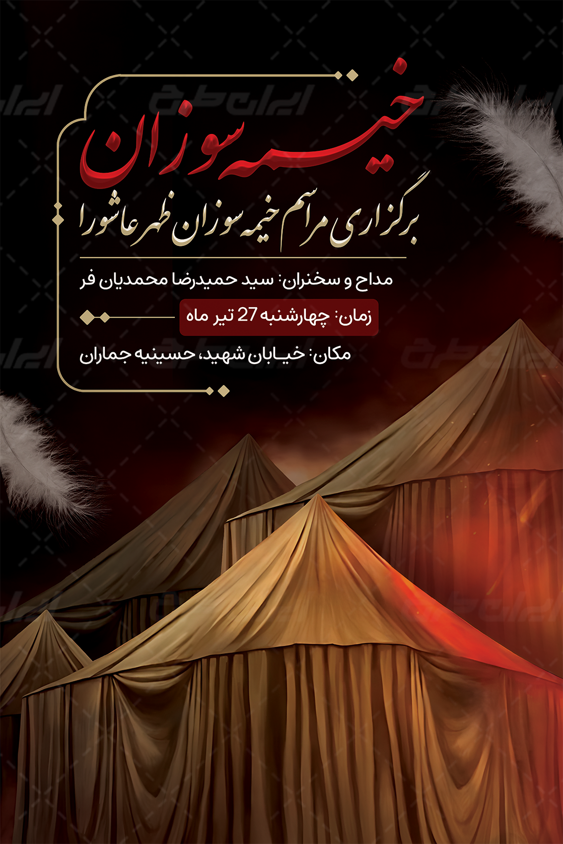 تصویر خیمه و متن مرتبط با مراسم خیمه سوزان می باشد که توسط طراحان ایران طرح در نرم افزار فتوشاپ طراحی شده است.