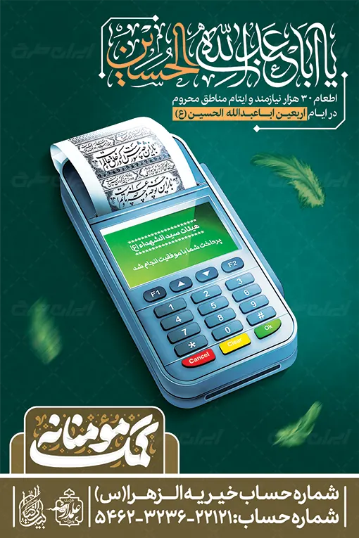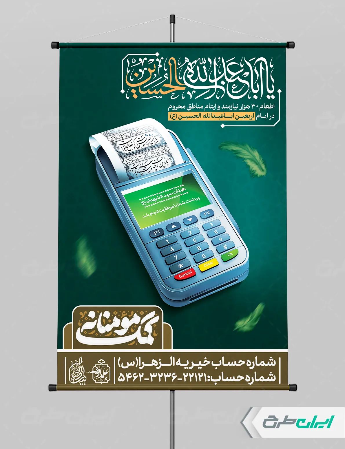 تصویر عذادار حسینی و ظرف نذری، متن مرتبط با مراسم کمک مومنانه اربعین میباشد که توسط طراحان ایران طرح در نرم افزار فتوشاپ طراحی شده است.