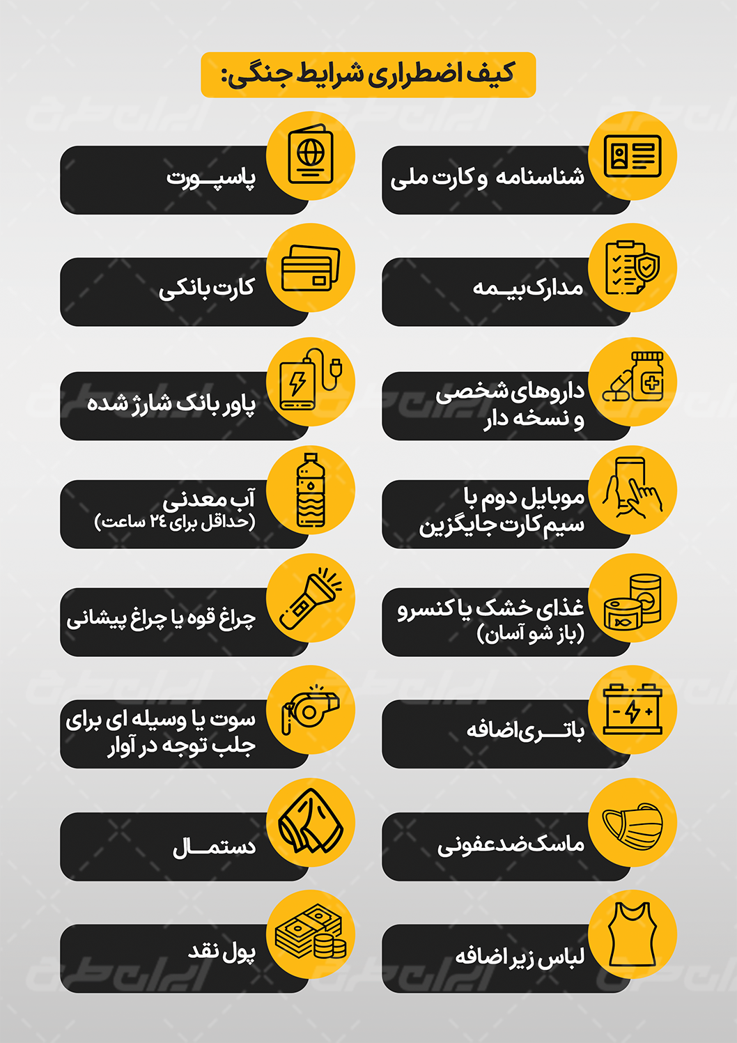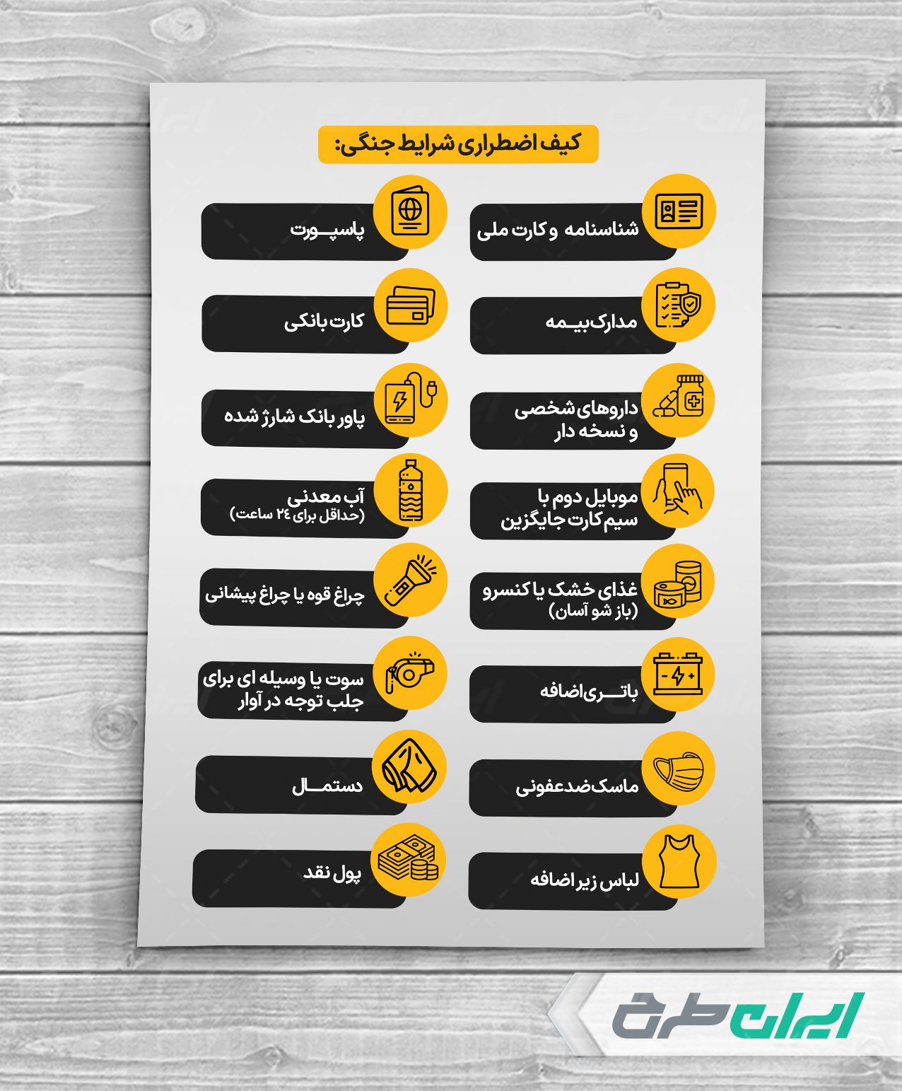 طرح پوستر نکات ایمنی و کیف اضطراری شرایط جنگی