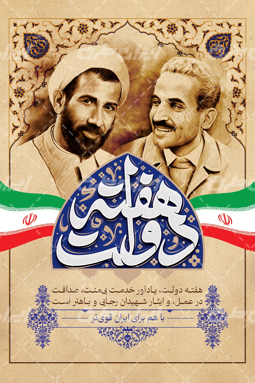 تصویر شهید رجایی و شهید باهنر، تایپوگرافی هفته دولت، تذهیب، کادر اسلیمی، نقوش اسلیمی و متن گرامیداشت هفته دولت میباشد که توسط طراحان ایران طرح در نرم افزار فتوشاپ طراحی شده است.