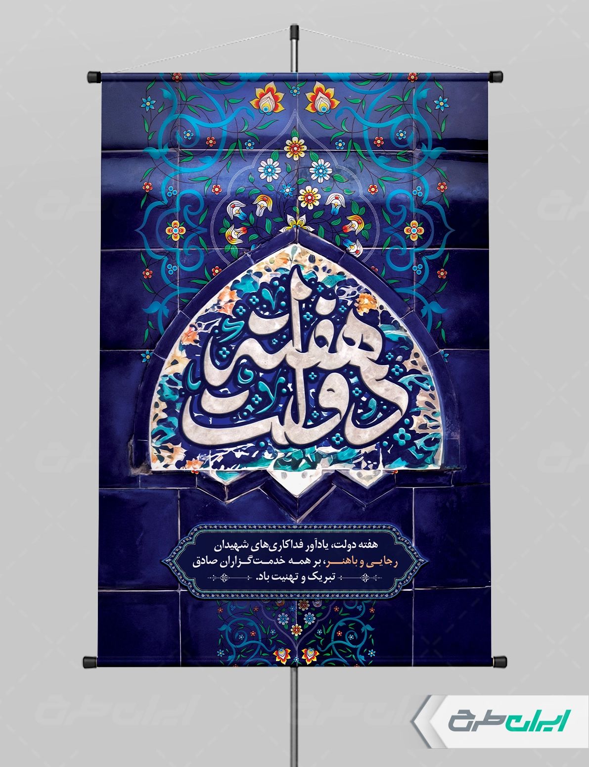 تایپوگرافی هفته دولت، تذهیب، کادر اسلیمی، نقوش اسلیمی و متن گرامیداشت هفته دولت میباشد که توسط طراحان ایران طرح در نرم افزار فتوشاپ طراحی شده است.
