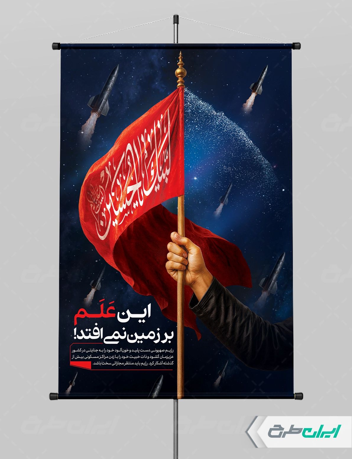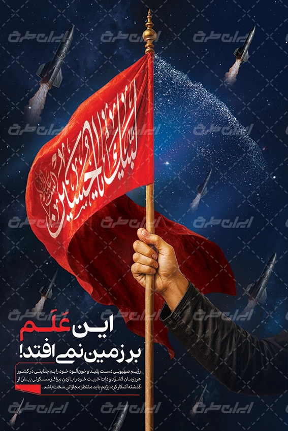 تصویر پرچم لبیک یا حسین و متن مرتبط با این حمله موشکی است که توسط تیم خلاق ایران طرح طراحی شده است.