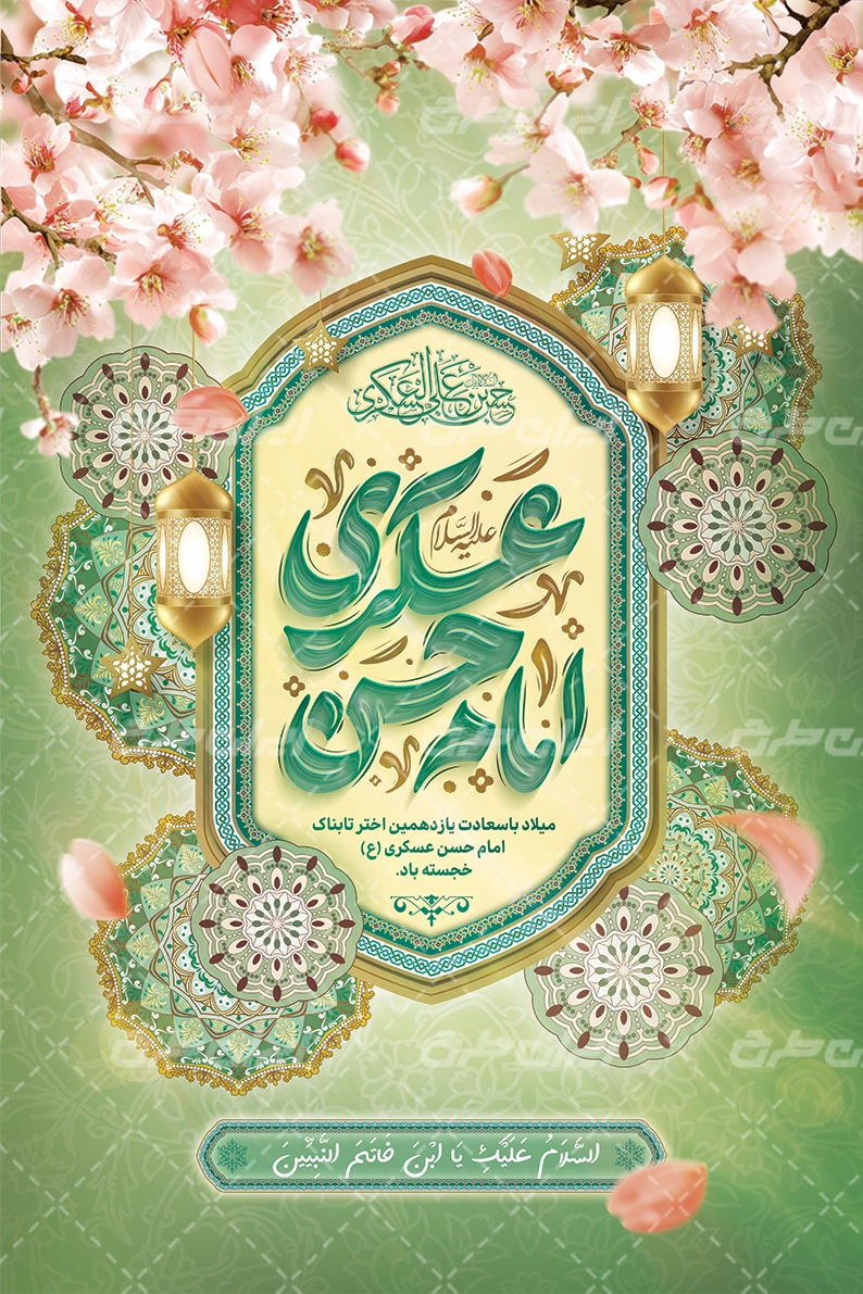 تایپوگرافی امام حسن عسکری , بنر لایه باز ولادت امام حسن عسکری , طرح ولادت امام حسن عسکری , طرح بنر ولادت امام حسن عسکری , اسلیمی , بنر لایه باز ولادت امام حسن عسکری , دانلود بنر ولادت امام حسن عسکری , گل و مرغ ایرانی , بنر میلاد امام حسن عسکری , تذهیب , کادر تذهیب ,