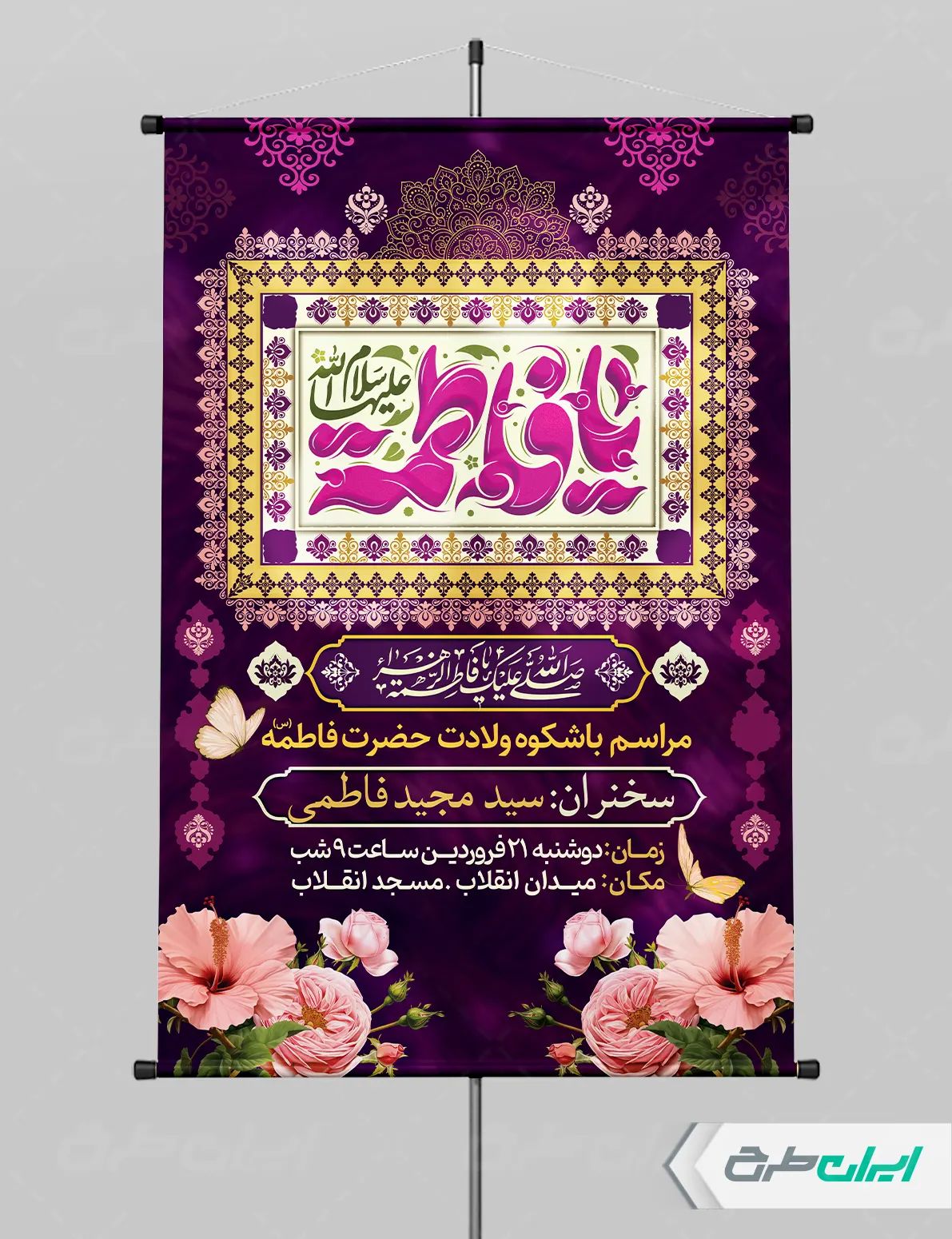- هم نشینی مناسب رنگ بنفش با طرح بنر ولادت حضرت فاطمه