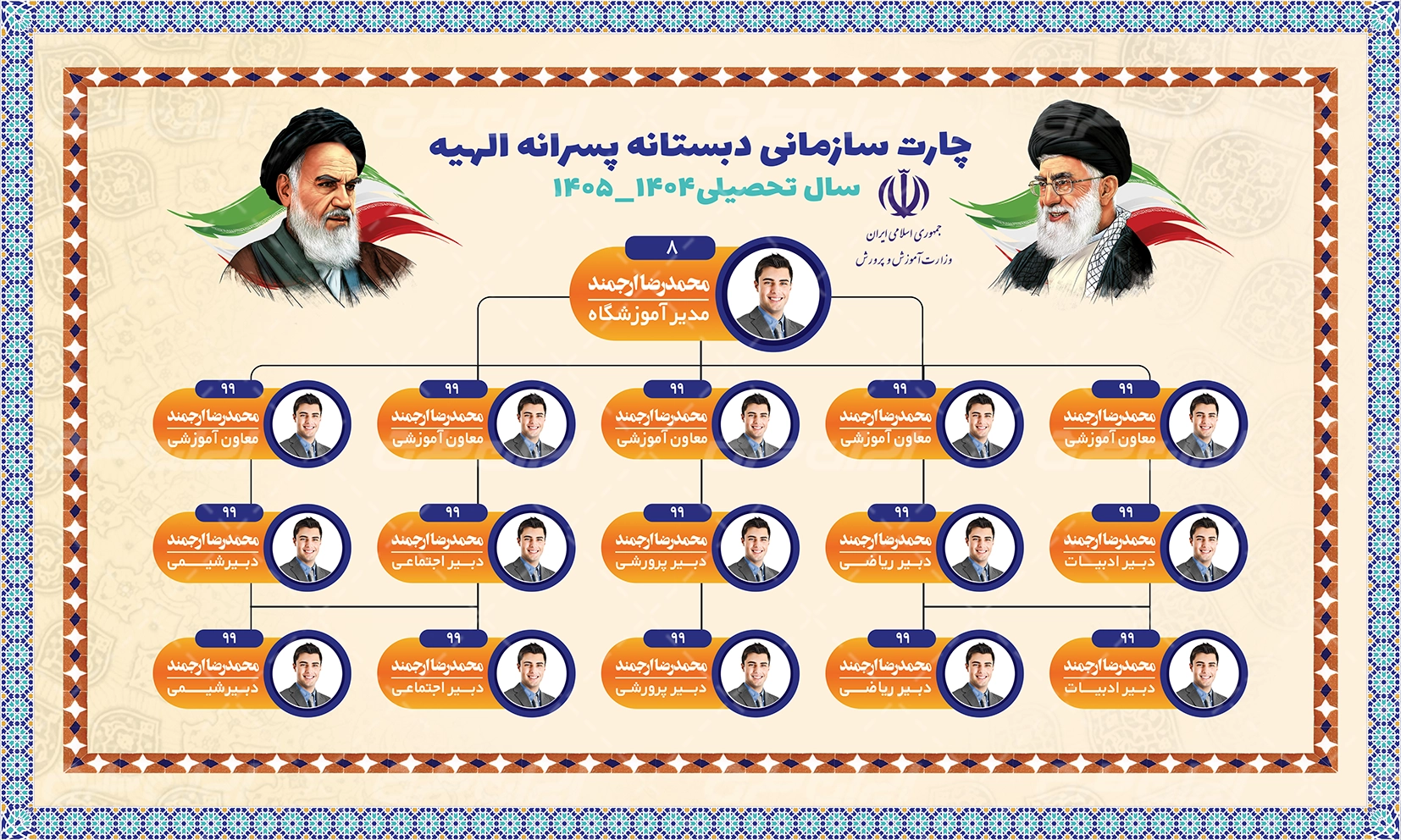 عکس ایت الله خامنه ای و امام خمینی (ره)، طرح چارت سازمانی دبستان مدرسه میباشد که توسط طراحان ایران طرح در نرم افزار فتوشاپ طراحی شده است.