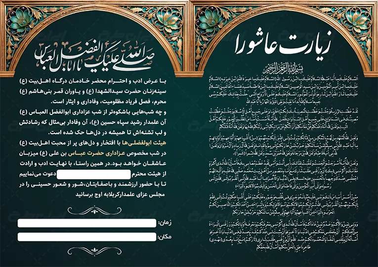 متن زیارت عاشورا و متن دعوت نامه می باشد که توسط طراحان ایران طرح در نرم افزار فتوشاپ طراحی شده است.