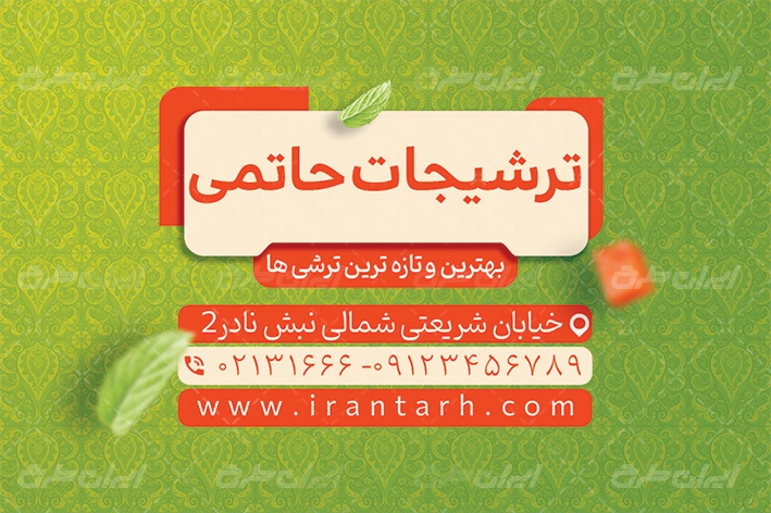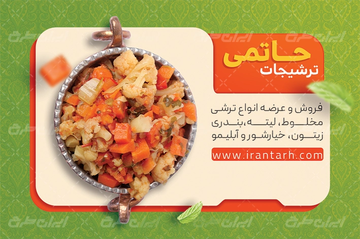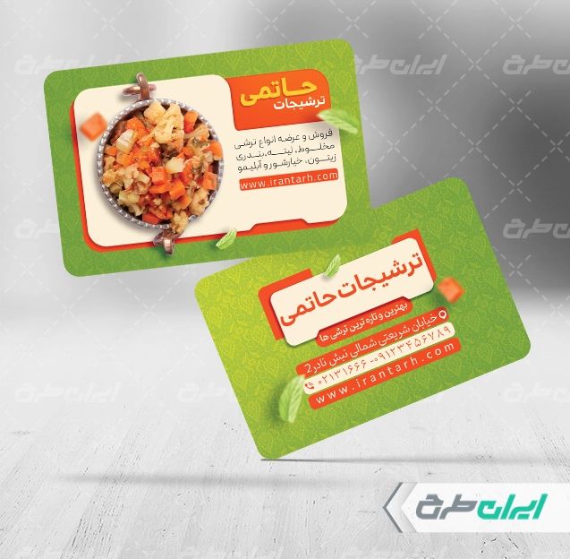 طرح لایه باز کارت ویزیت فروشگاه ترشیجات، جهت بازاریابی و تبلیغات این دسته از فروشگاه ها توسط تیم طراحان ایران طرح طراحی و در دسترس کاربران سایت قرار گرفته است.