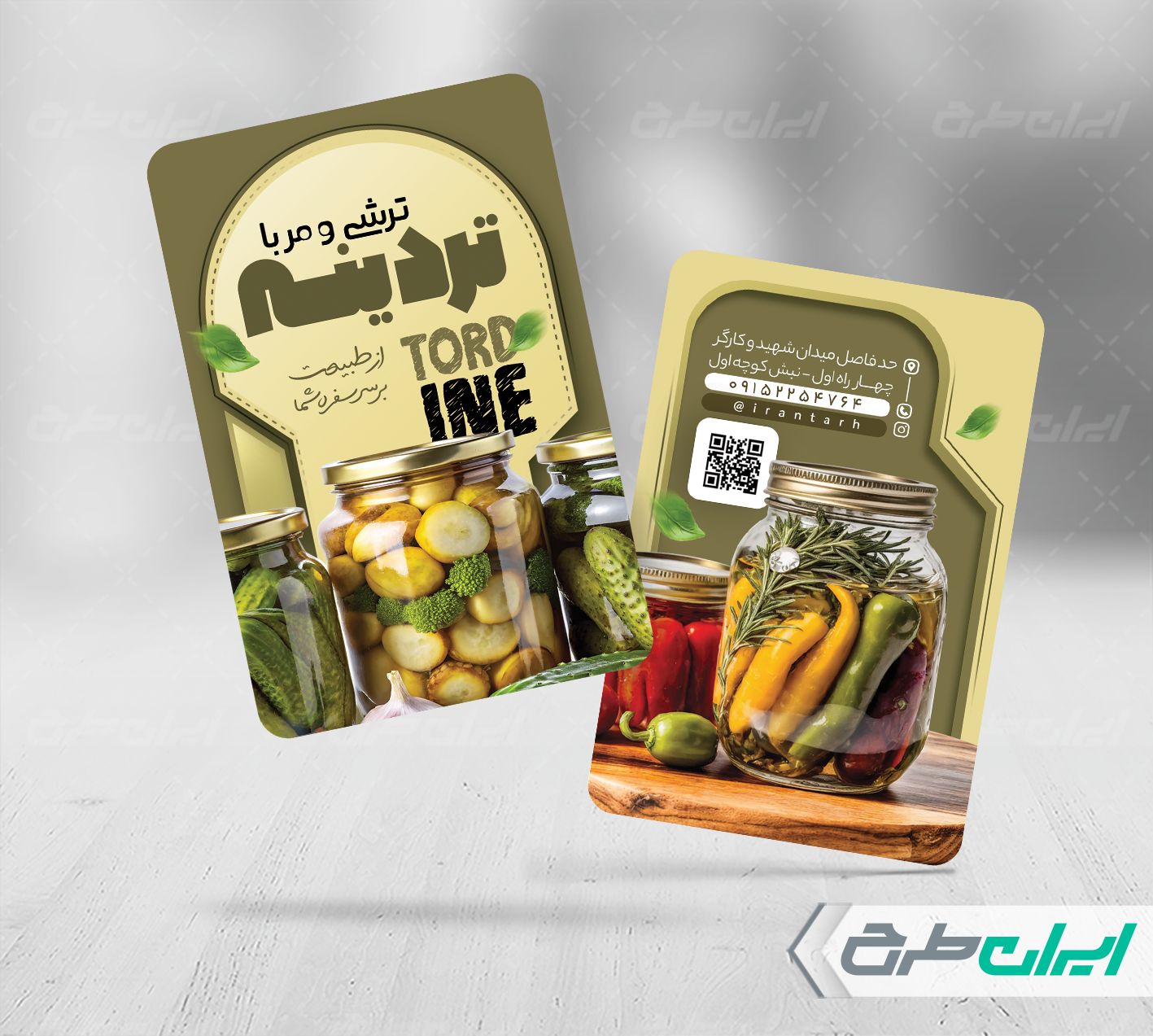 طرح لایه باز کارت ویزیت فروشگاه ترشیجات، جهت بازاریابی و تبلیغات این دسته از فروشگاه ها توسط تیم طراحان ایران طرح طراحی و در دسترس کاربران سایت قرار گرفته است.