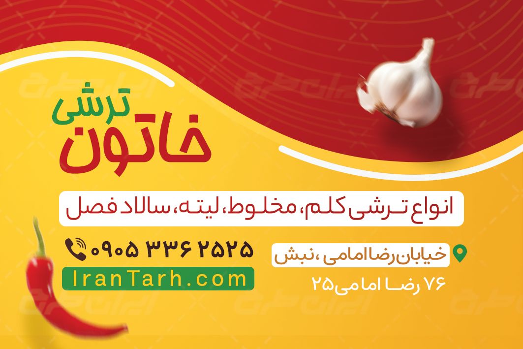 طرح لایه باز کارت ویزیت فروشگاه ترشیجات، جهت بازاریابی و تبلیغات این دسته از فروشگاه ها توسط تیم طراحان ایران طرح طراحی و در دسترس کاربران سایت قرار گرفته است.