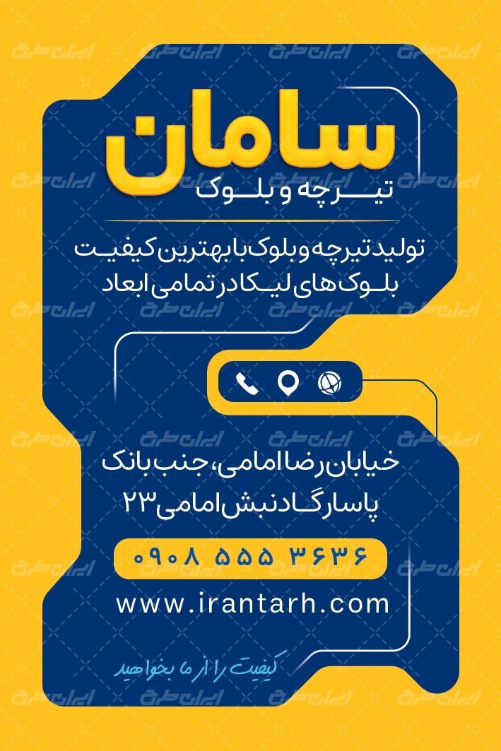 طرح کارت ویزیت بلوک زنی و تیرچه زنی ساختمان، توسط تیم ایران طرح برای بازاریابی و تبلیغات این فروشگاه طراحی شده است.