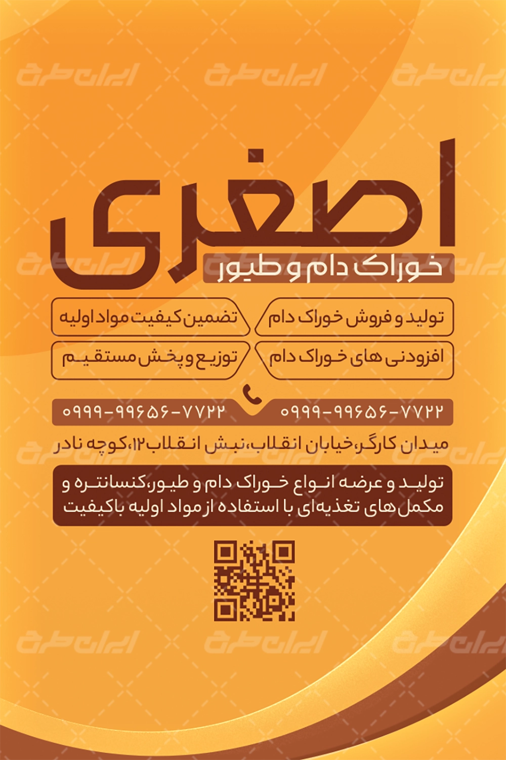 ایران طرح کارت ویزیت خوراک دام و طیور را جهت تبلیغات و بازاریابی این فروشگاه ها، طراحی و در دسترس کاربران سایت قرار داده است.