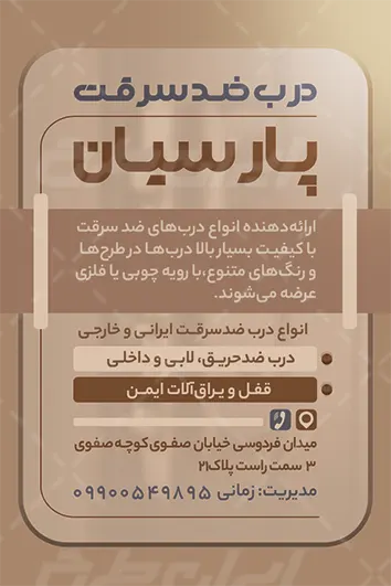 کارت ویزیتهای فروشگاههای درب ضد سرقت میتوانند اطلاعات دقیق و مفیدی در خصوص انواع دربها، ویژگیهای امنیتی، و مزایای استفاده از دربهای ضد سرقت ارائه دهند. طراحی کارت ویزیت باید بهگونهای باشد که مشتریان احساس کنند میتوانند به فروشگاه شما برای تأمین امنیت منزل خود اعتماد کنند. استفاده از تصاویری از دربهای شیک و مقاوم در برابر سرقت و درج جزئیات مهم مانند نوع قفلها، مواد بهکاررفته در ساخت دربها، و ضمانتهای امنیتی میتواند مشتریان را به بازدید از فروشگاه و خرید ترغیب کند. علاوه بر این، کارت ویزیت میتواند اطلاعاتی مانند آدرس، شماره تماس، و حتی لینک به وبسایت فروشگاه برای مشاهده محصولات و دریافت مشاوره آنلاین ارائه دهد.