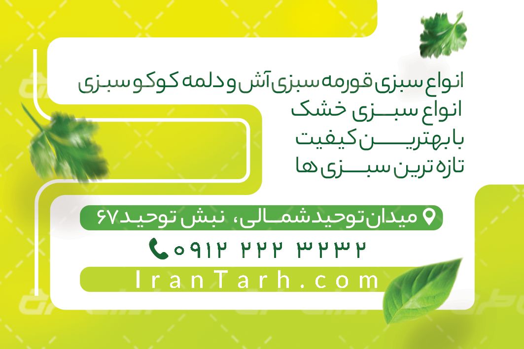 طرح لایه باز کارت ویزیت سبزیجات آماده، جهت بازاریابی و تبلیغات این دسته از مغازه ها توسط تیم طراحان ایران طرح طراحی و در دسترس کاربران سایت قرار گرفته است.