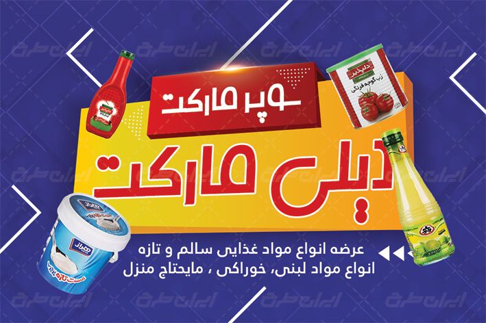 با استفاده از بنر لایه باز کارت ویزیت با زمینه آبی و نارنجی و عکس مواد غذایی، میتوانید برند سوپرمارکت خود را تبلیغ کرده، به تشخیص و شناخت آسان و سریع توسط مشتریان بپردازید و در نتیجه، فروش و رونق کسب و کار خود را بهبود بخشید.