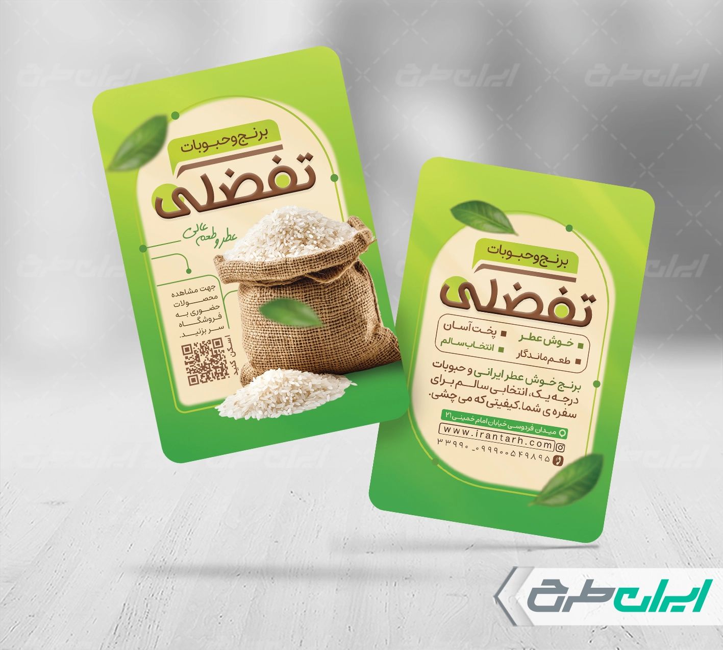 طرح کارت ویزیت فروشگاه برنج، جهت بازاریابی و تبلیغات این دسته از فروشگاه ها توسط تیم طراحان ایران طرح طراحی و در دسترس کاربران سایت قرار گرفته است.