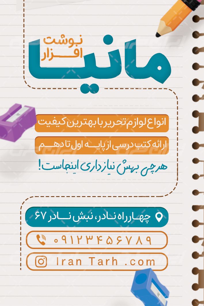 طرح کارت ویزیت فروشگاه لوازم تحریر، توسط تیم ایران طرح جهت تبلیغات و بازاریابی این دسته از فروشگاه ها طراحی شده است.