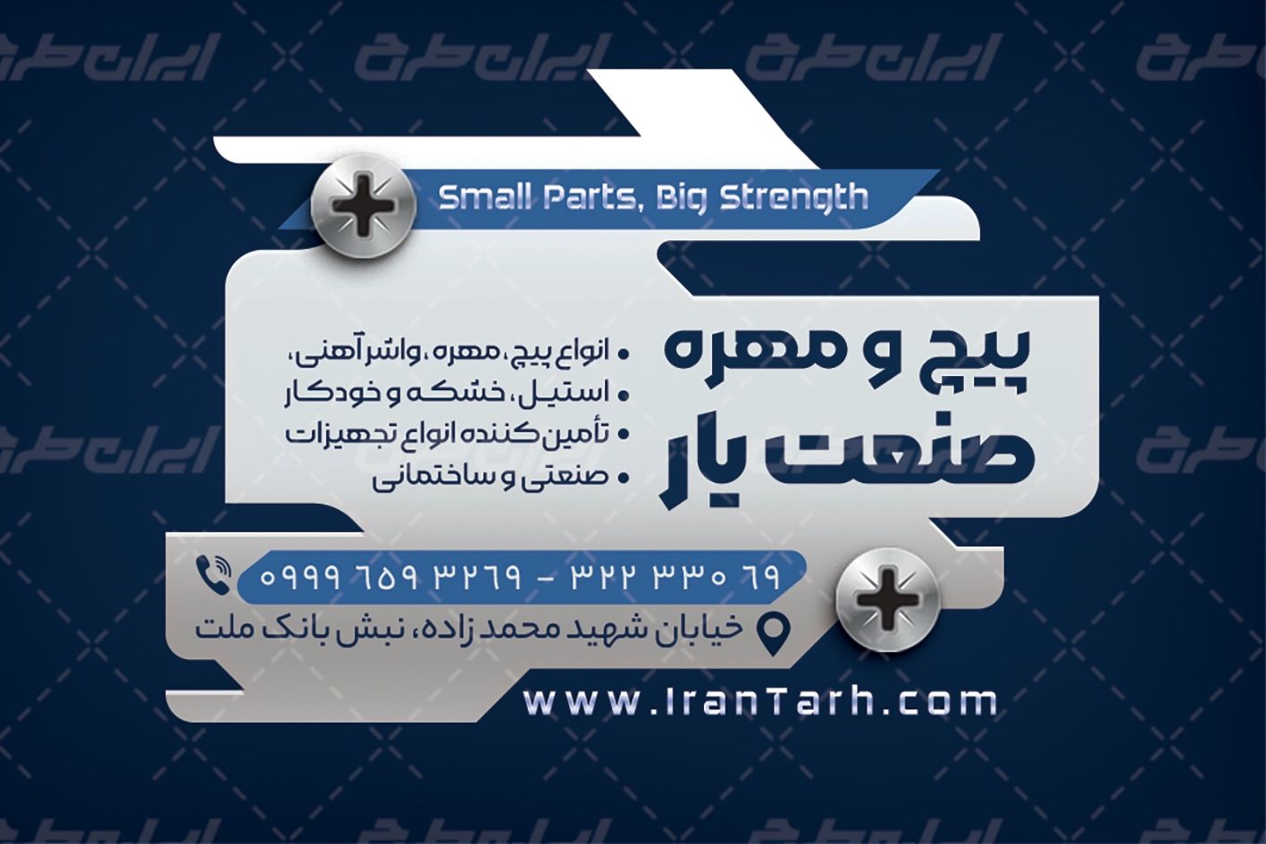 کارت ویزیت پیچ و مهره، جهت بازاریابی و تبلیغات این دسته از فروشگاه ها توسط تیم طراحان ایران طرح طراحی و در دسترس کاربران سایت قرار گرفته است.