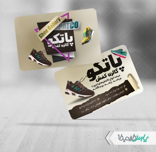 طرح کارت ویزیت گالری کفش، جهت بازاریابی و تبلیغات این فروشگاه ها توسط پارس گرافیک طراحی و در اختیار کاربران سایت قرار گرفته است.