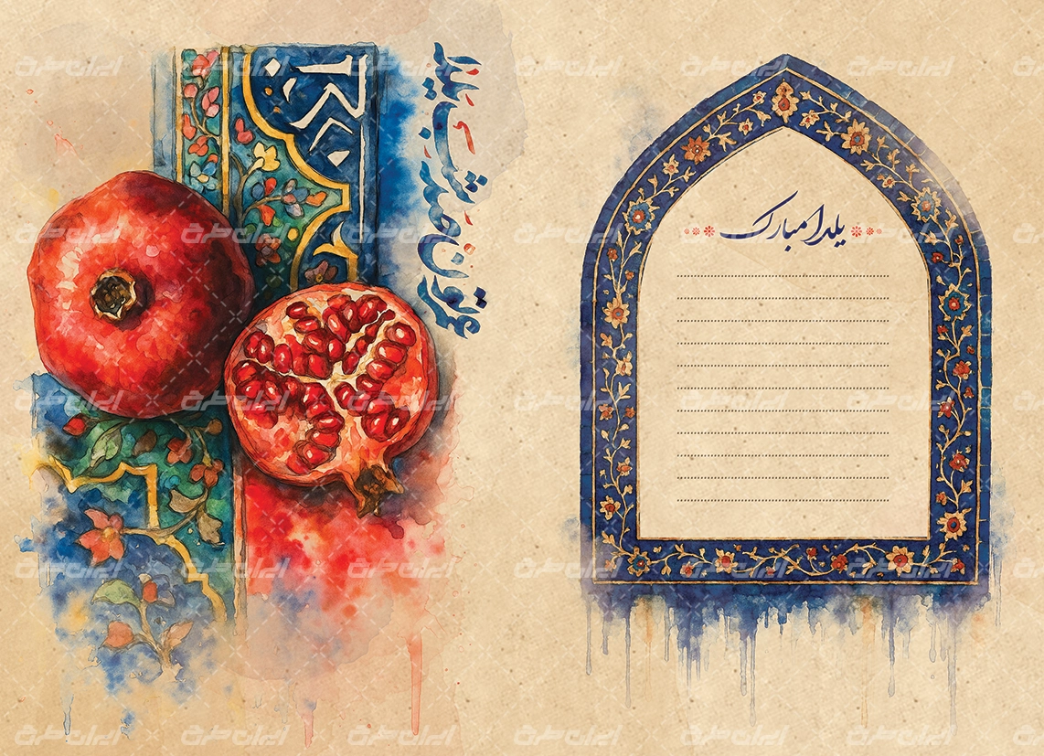 طرح کارت پستال یلدا در نرم افزار فتوشاپ به صورت لایه باز طراحی شده و شامل :