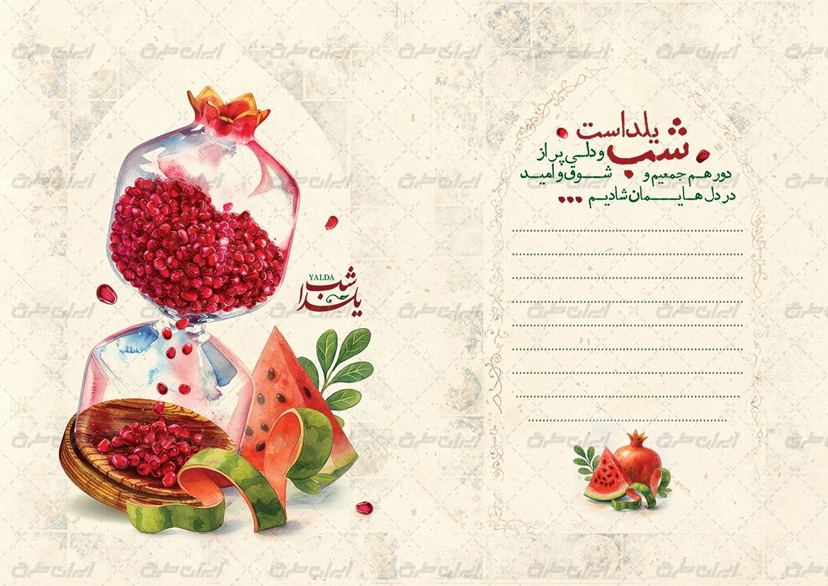 طرح کارت پستال یلدا در نرم افزار فتوشاپ به صورت لایه باز طراحی شده و شامل :