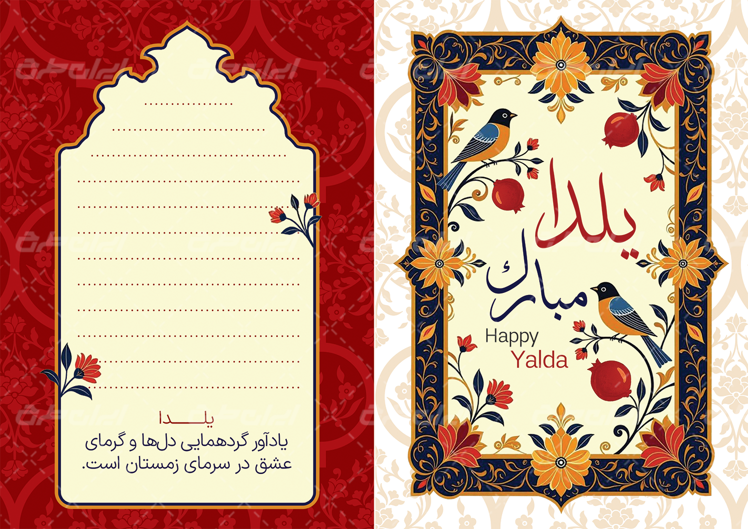 طرح کارت پستال یلدا در نرم افزار فتوشاپ به صورت لایه باز طراحی شده و شامل :