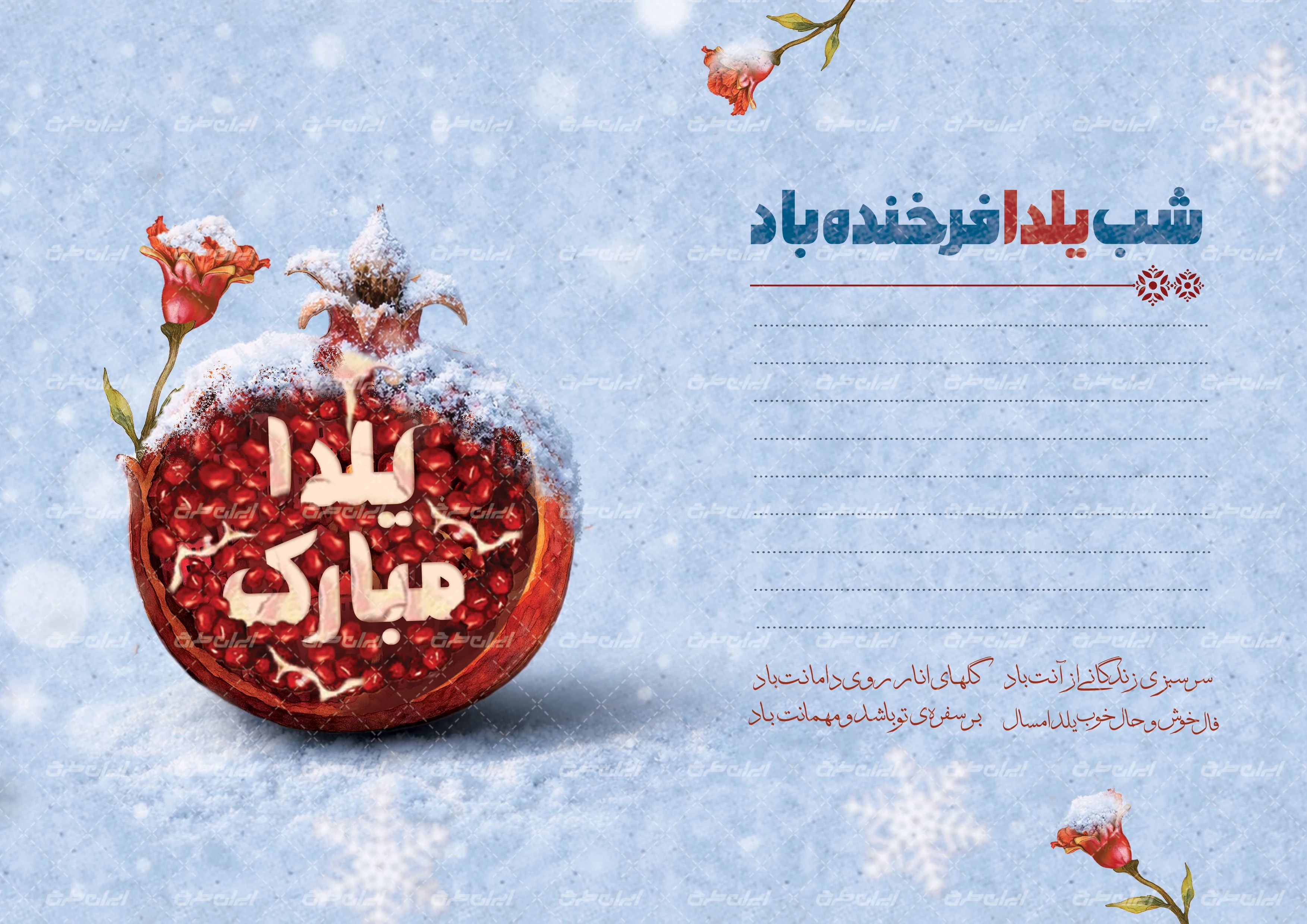 طرح کارت پستال یلدا در نرم افزار فتوشاپ به صورت لایه باز طراحی شده و شامل :