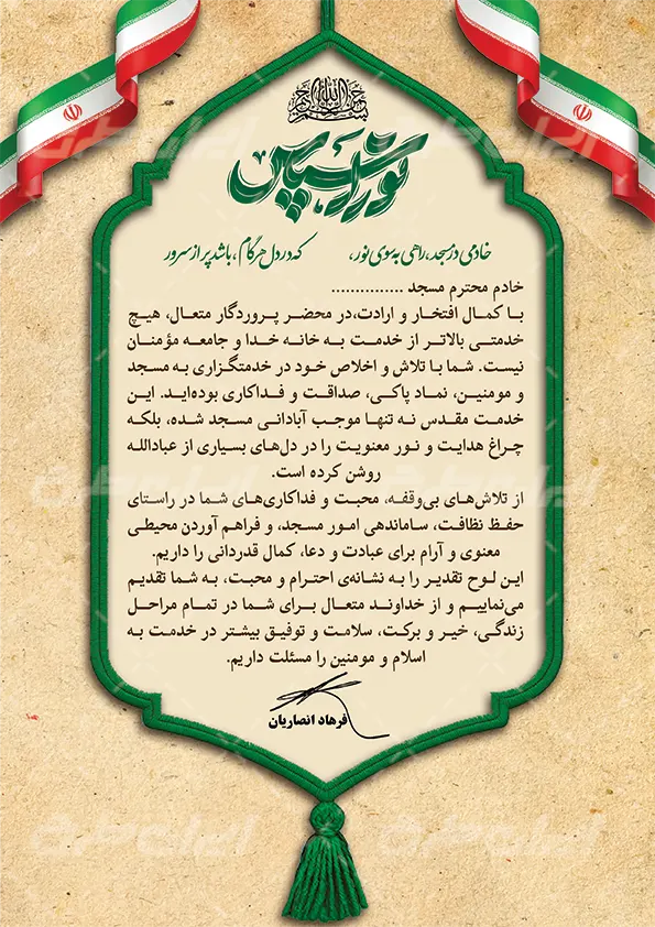 تایپوگرافی، کادر مذهبی، تذهیب، حاشیه تذهیب،نقوش اسلیمی، گل و متن تقدیر و تشکر می باشد که توسط طراحان ایران طرح در نرم افزار فتوشاپ طراحی شده است.