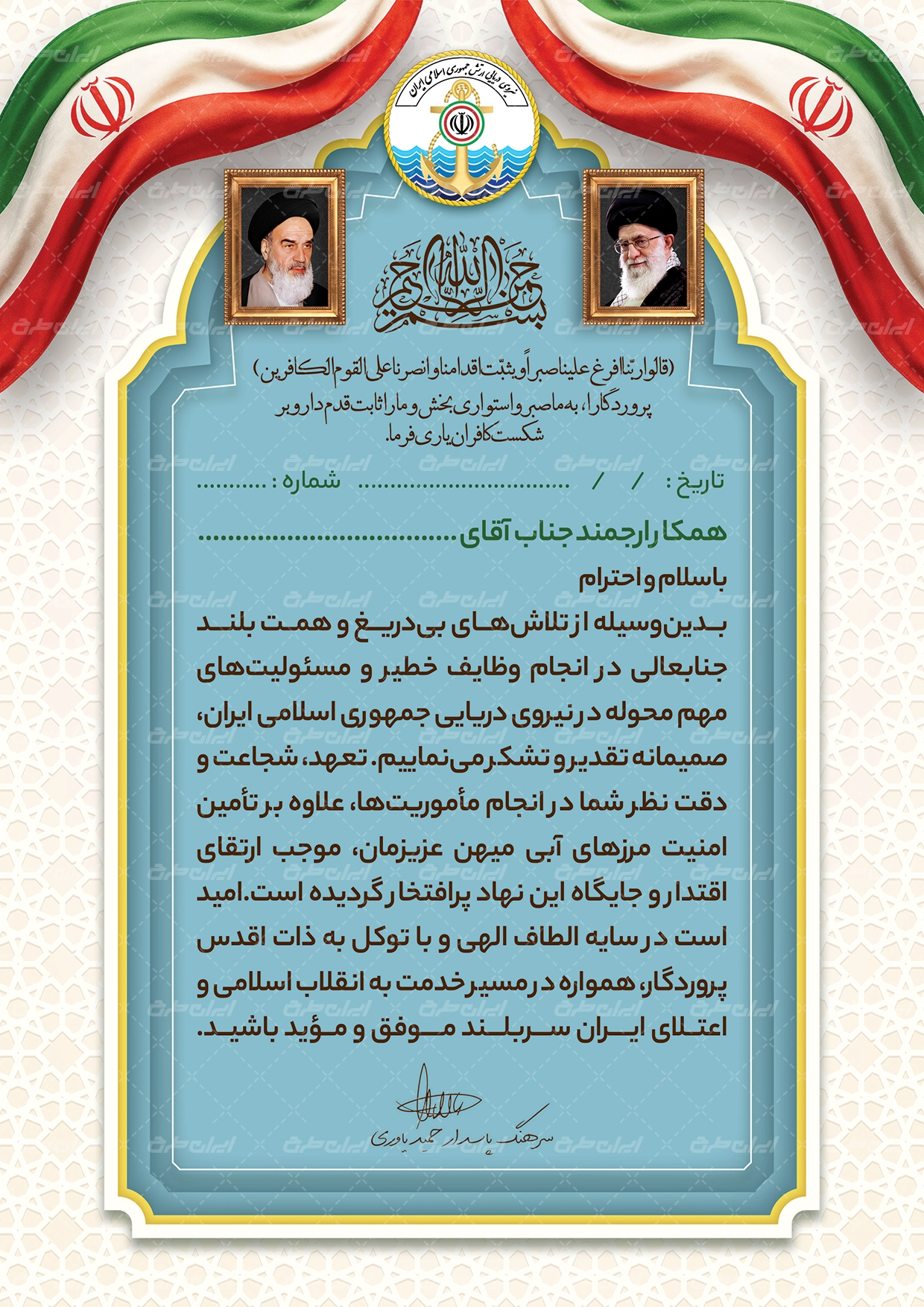لوگوی نیروی دریایی، پرچم ایران، تایپوگرافی، کادر مذهبی، تذهیب، حاشیه تذهیب، گل، جلوه نور و متن تقدیر و تشکر می باشد که توسط طراحان ایران طرح در نرم افزار فتوشاپ طراحی شده است.