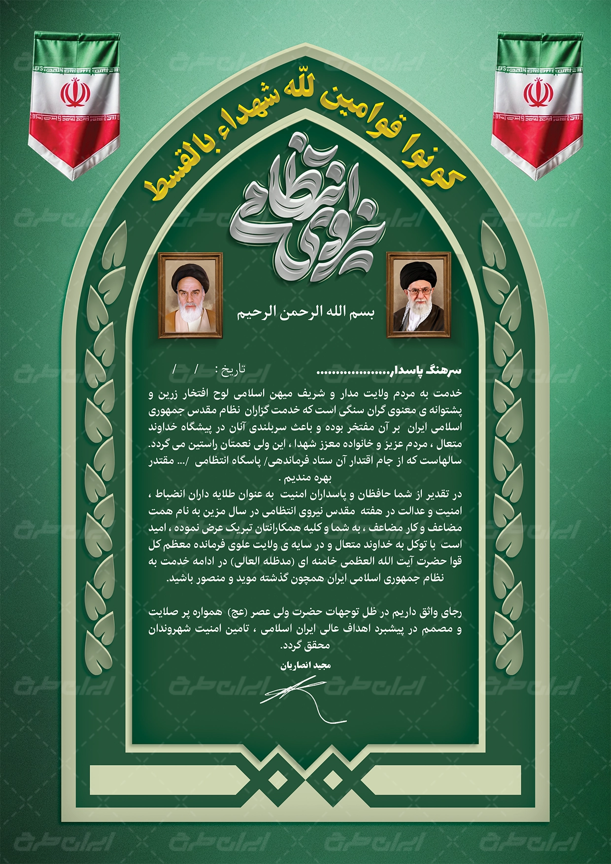 لوگوی نیروی انتظامی، تایپوگرافی، کادر مذهبی، تذهیب، حاشیه تذهیب، گل، جلوه نور و متن تقدیر و تشکر می باشد که توسط طراحان ایران طرح در نرم افزار فتوشاپ طراحی شده است.