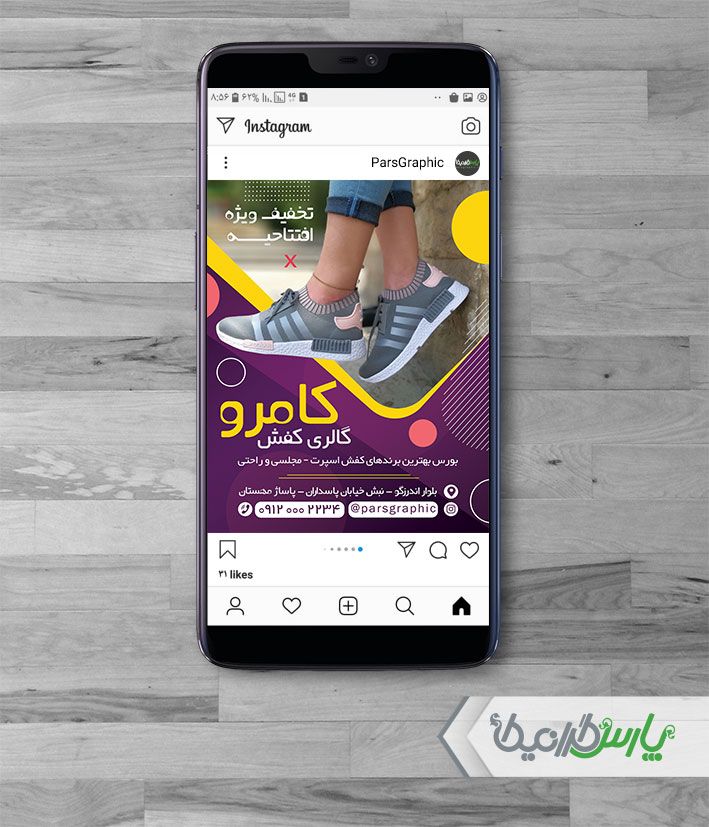 طرح لایه باز پست تبلیغاتی اینستاگرام کفش فروشی با پسوند psd طراحی و قابل اجرا در نرم افزار فتوشاپ میباشد.