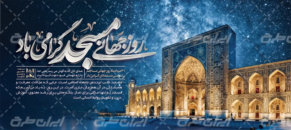 - استفاده مناسب عکس با کیفیت مسجد و متن گرامیداشت روز جهانی مساجد در طرح بنر روز جهانی مسجد
