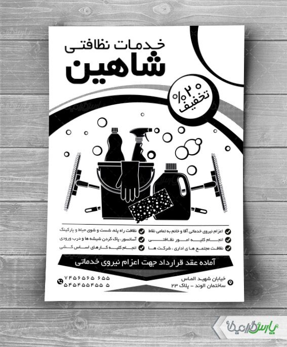 طرح تراکت خدمات نظافتی و دفتر خدماتی بصورت سیاه و سفید طراحی شده است .