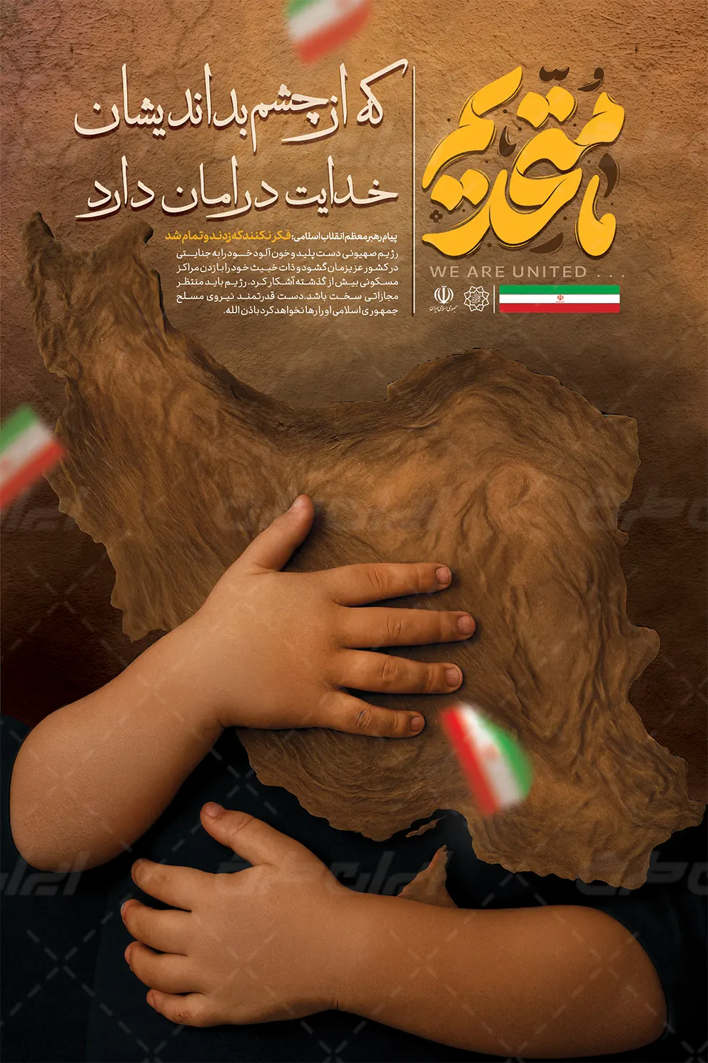 تایپوگرافی ما متحدیم و متن مرتبط با این حمله موشکی است که توسط تیم خلاق ایران طرح طراحی شده است.