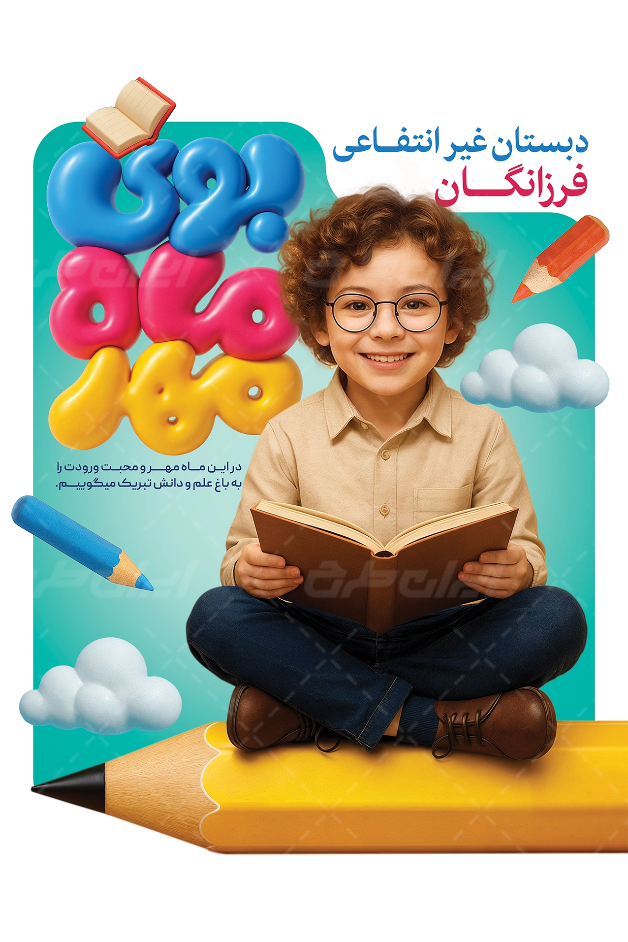 تصویر دانش آموز و تایپوگرافی بوی ماه مهر در نرم افزار فتوشاپ طراحی شده است.