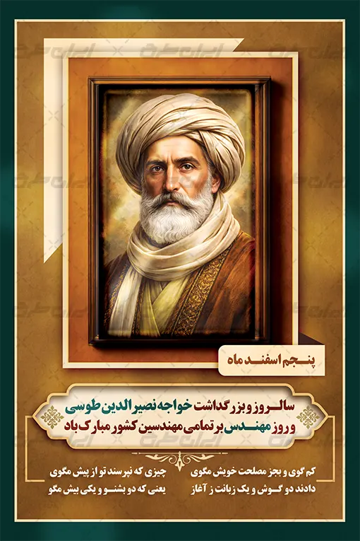 تصویر خواجه نصیرالدین طوسی و متن گرامیداشت روز مهندس و روز خواجه نصیرالدین طوسی می باشد که توسط تیم ایران طرح طراحی شده است.
