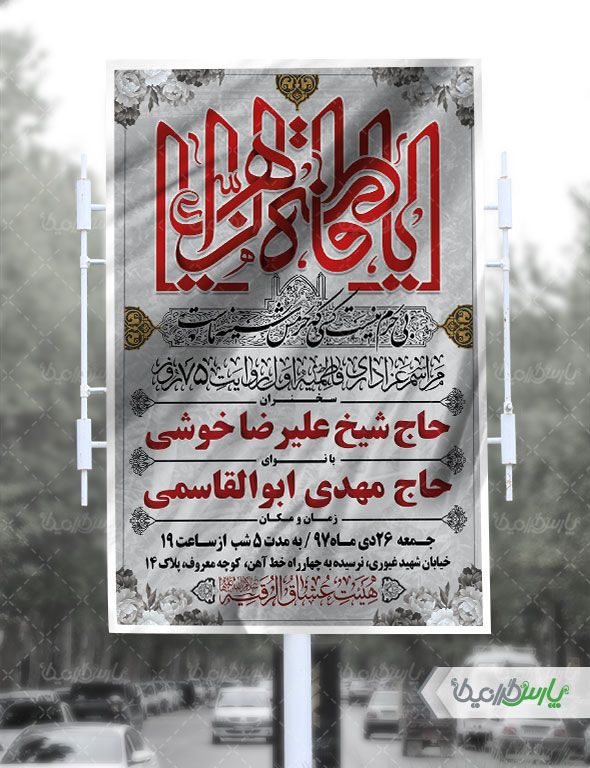 طرح بنر شهادت حضرت فاطمه (س) بصورت عمودی و با زمینه رنگ خاکستری طراحی شده است .