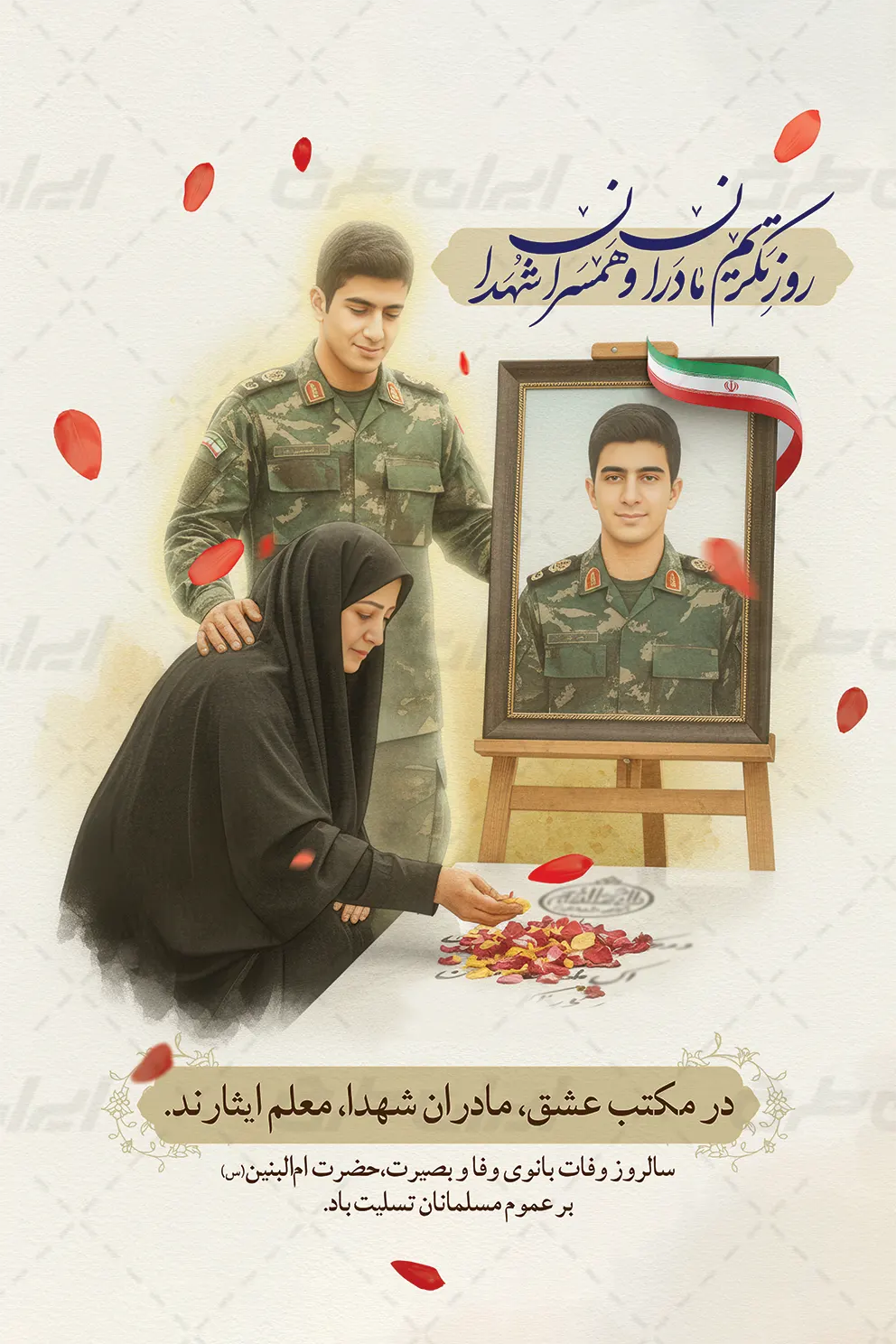 تصویر مادرشهید، قاب عکس شهید، پرچم ایران و متن گرامیداشت روز تکرمی مادران شهدا می باشد که توسط تیم ایران طرح طراحی شده است.