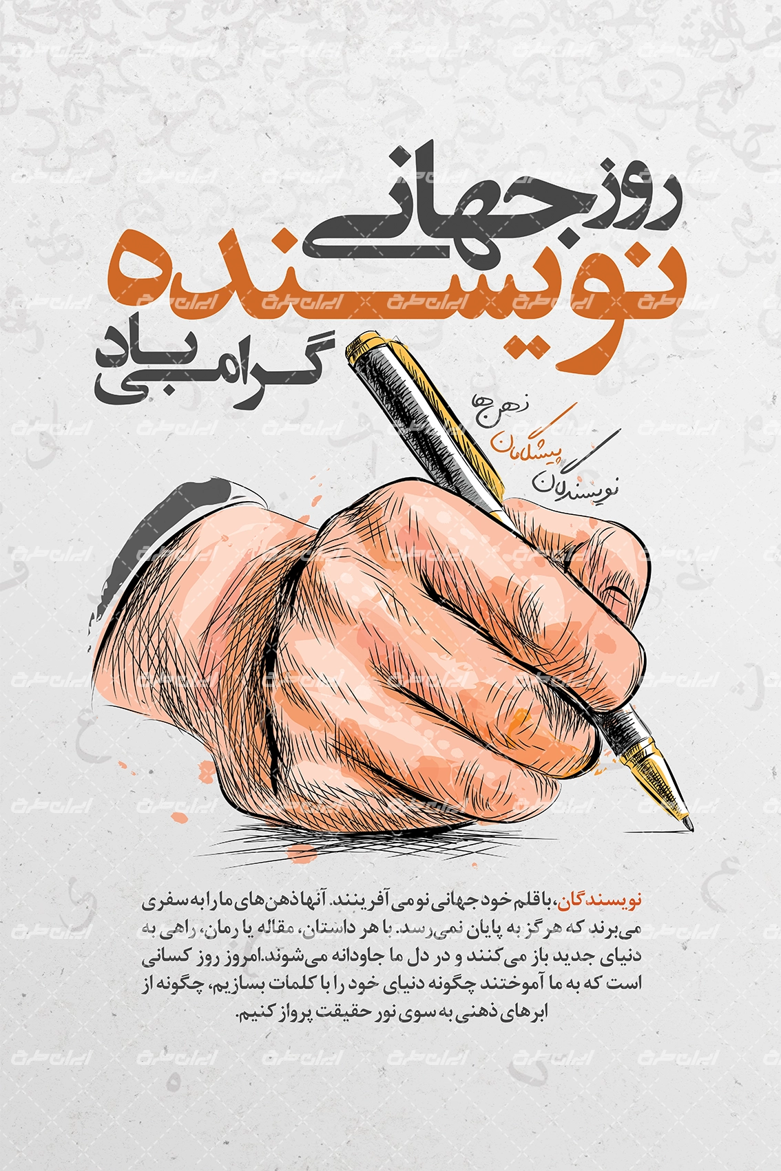 تصویر نویسنده و متن گرامیداشت روز جهانی نویسنده می باشد که توسط تیم ایران طرح طراحی شده است.