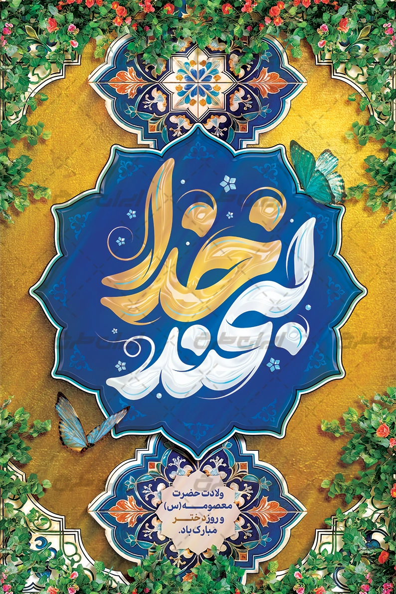 تایپوگرافی لبخند خدا، تذهیب، طرح گل و متن گرامیداشت ولادت حضرت معصومه (س) و روز دختر می باشد که توسط تیم ایران طرح طراحی شده است.