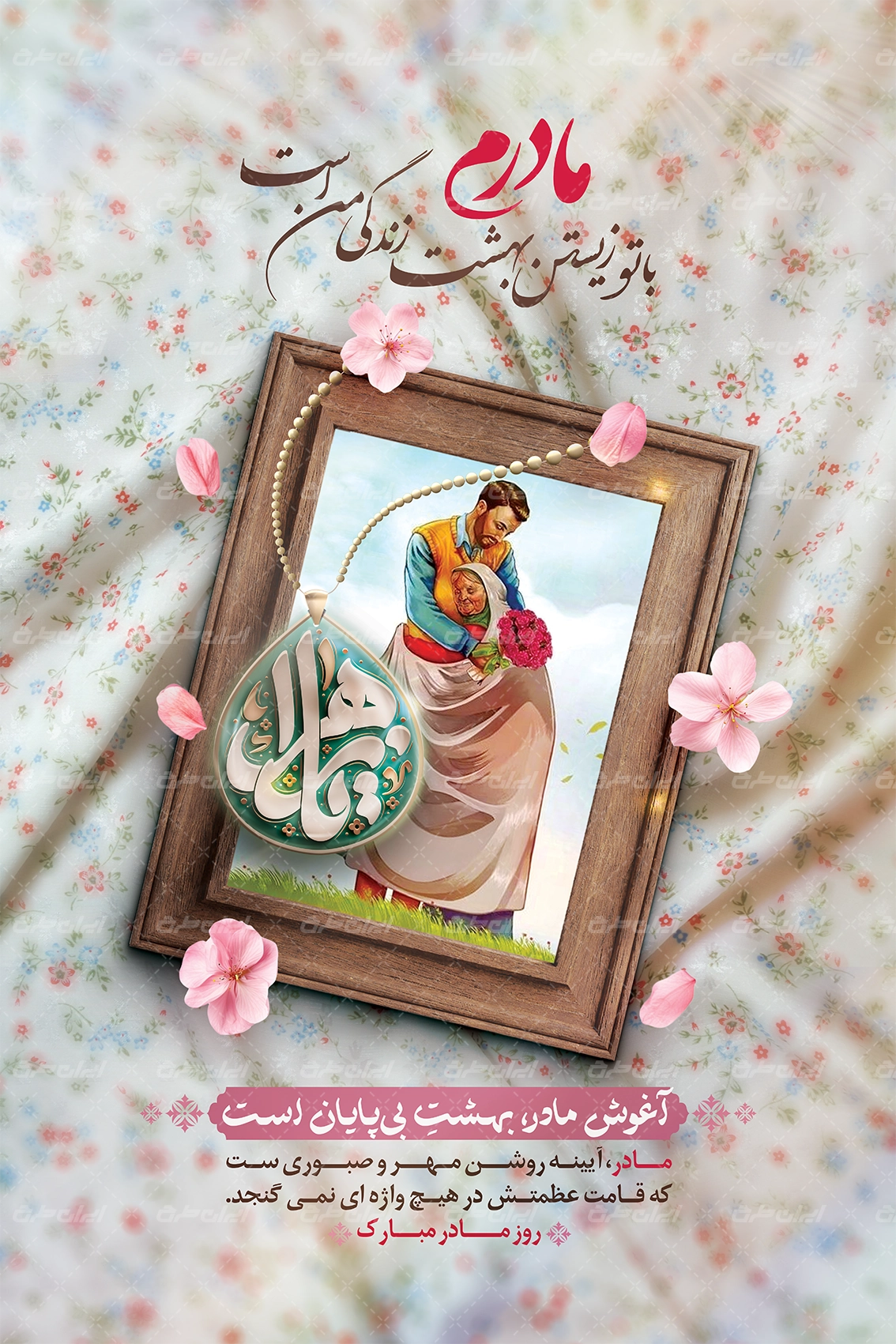 تصویر مادر و متن تبریک روز مادر و روز زن می باشد که توسط تیم ایران طرح طراحی شده است.