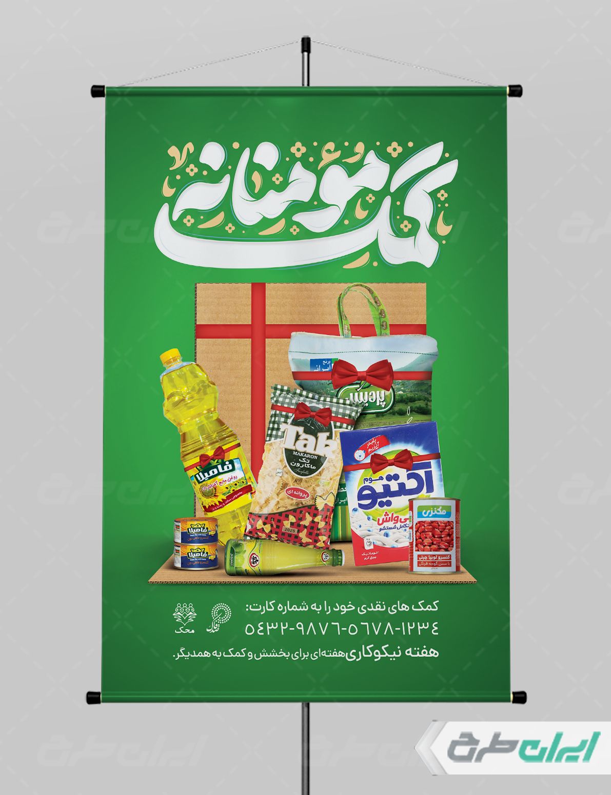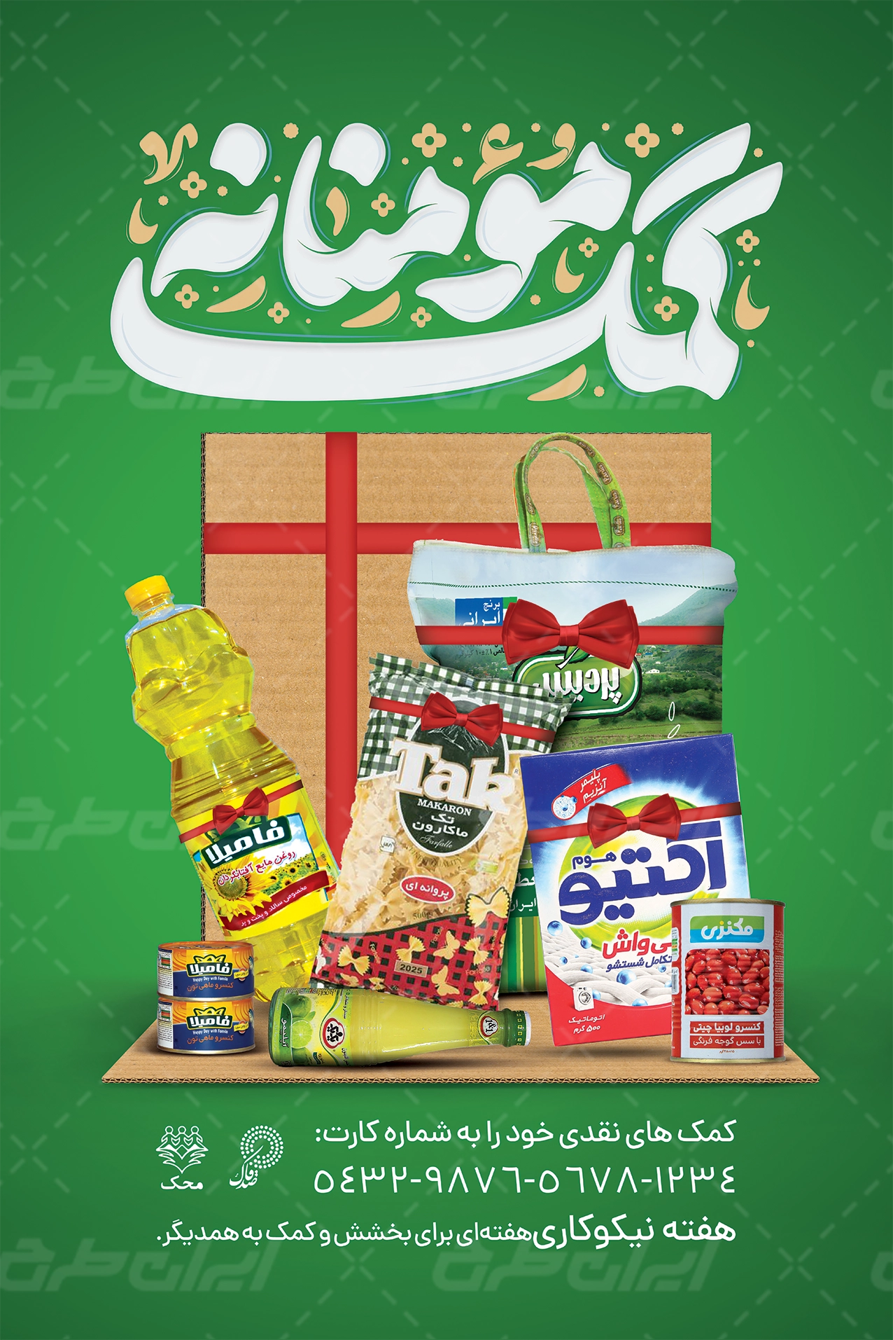 تصویر مواد غذایی و تایپوگرافی کمک مومنانه و متن گرامیداشت روز احسان و نیکو کاری می باشد که توسط تیم ایران طرح طراحی شده است.
