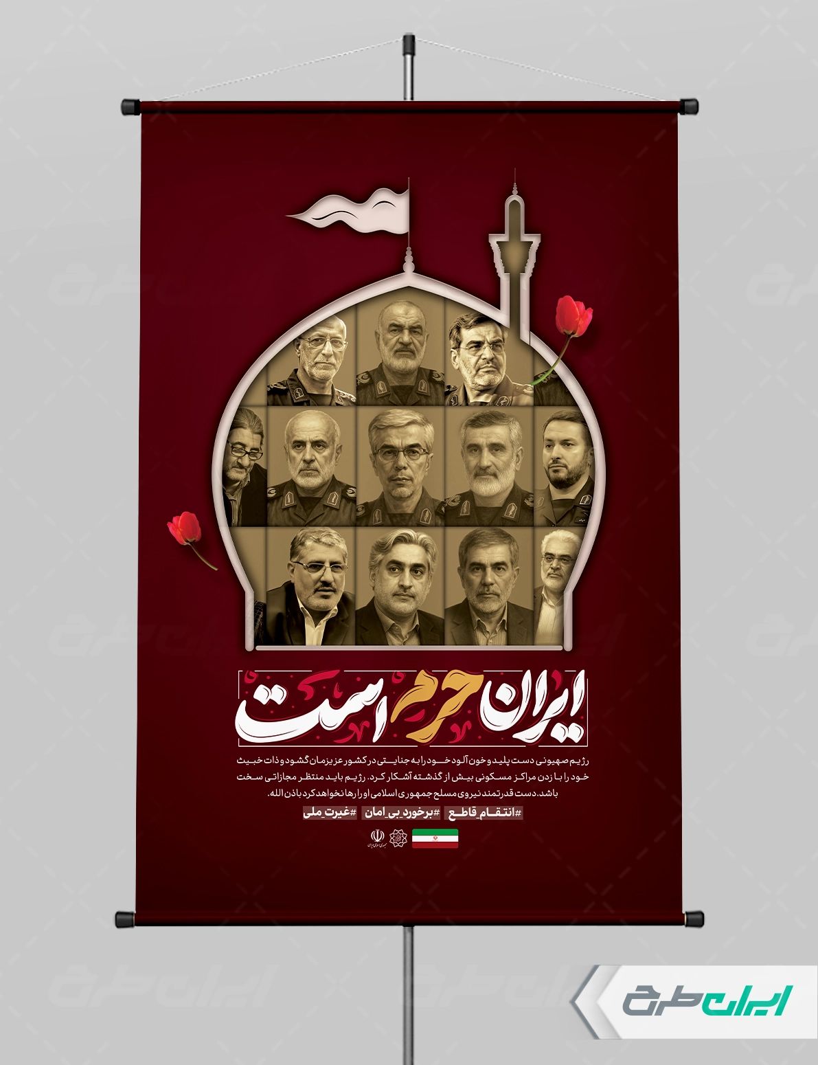 تایپوگرافی ایران حرم است تصویر شهید باقری سرداران سپاه و متن مرتبط با این حمله موشکی است که توسط تیم خلاق ایران طرح طراحی شده است.
