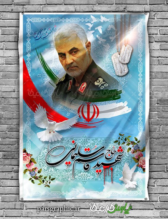 در طرح بنر لایه باز ترحیم از تصویر کبوتر و پرچم ایران و تصویر سردار شهید سلیمانی استفاده شده است .