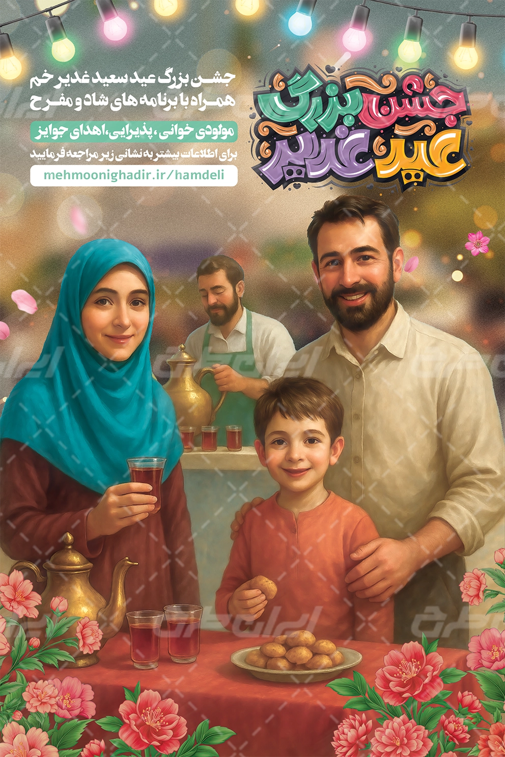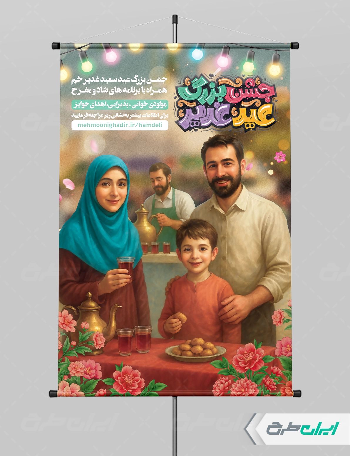 تایپوگرافی جشن بزرگ عید غدیر، تصویر خانواده ایرانی و متن تبریک عید غدیر خم می باشد که توسط طراحان ایران طرح در نرم افزار فتوشاپ طراحی شده است.