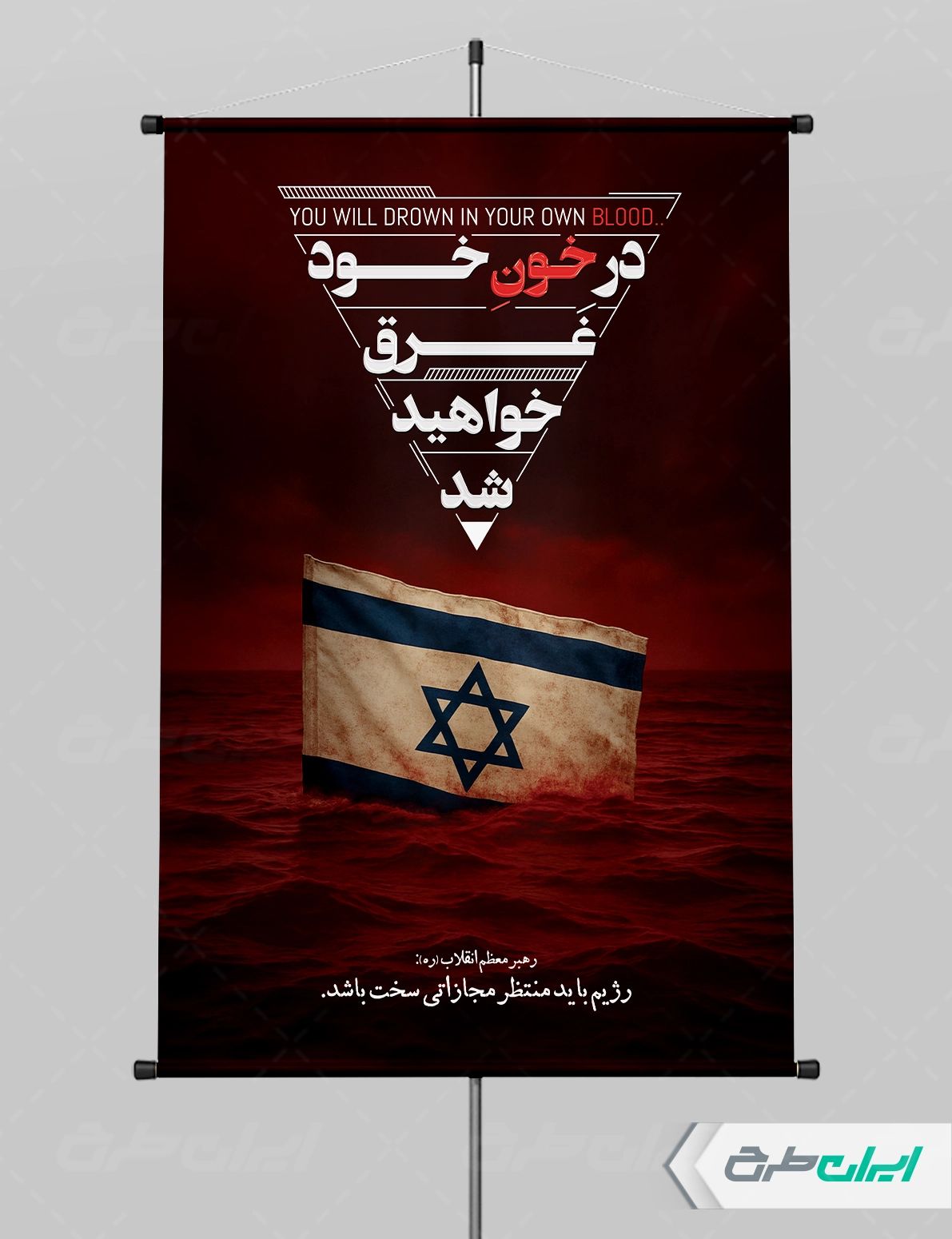 تصویر پرچم اسرائیل و متن مرتبط با این حمله موشکی است که توسط تیم خلاق ایران طرح طراحی شده است.