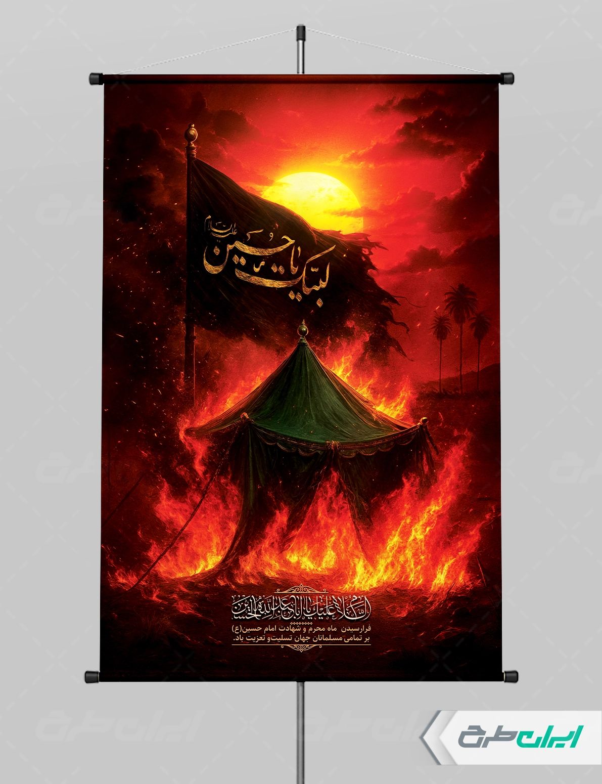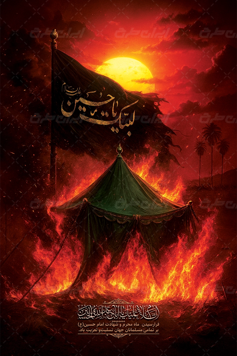 تصویر خیمه و آتش و متن تسلیت ایام محرم می باشد که توسط طراحان ایران طرح در نرم افزار فتوشاپ طراحی شده است.