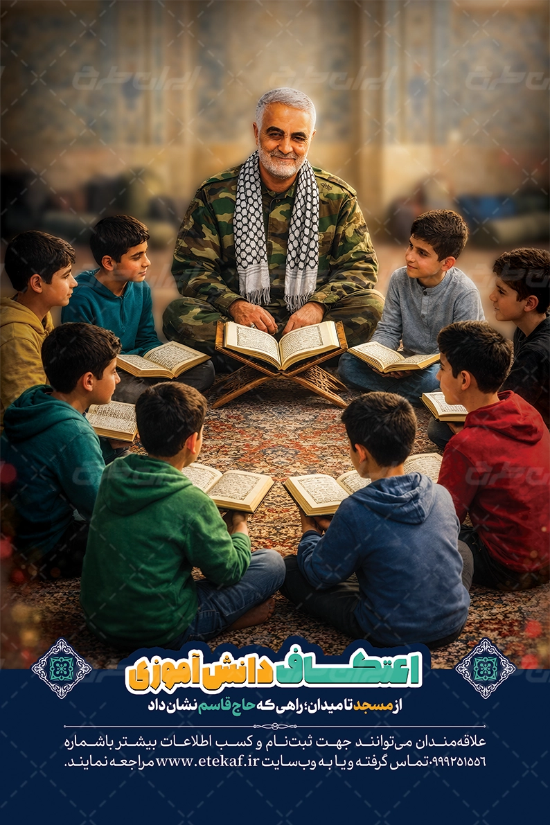 تصویر شهید سردار قاسم سلیمانی و متن مرتبط با بنر اطلاع رسانی مراسم اعتکاف می باشد که توسط تیم ایران طرح طراحی شده است.