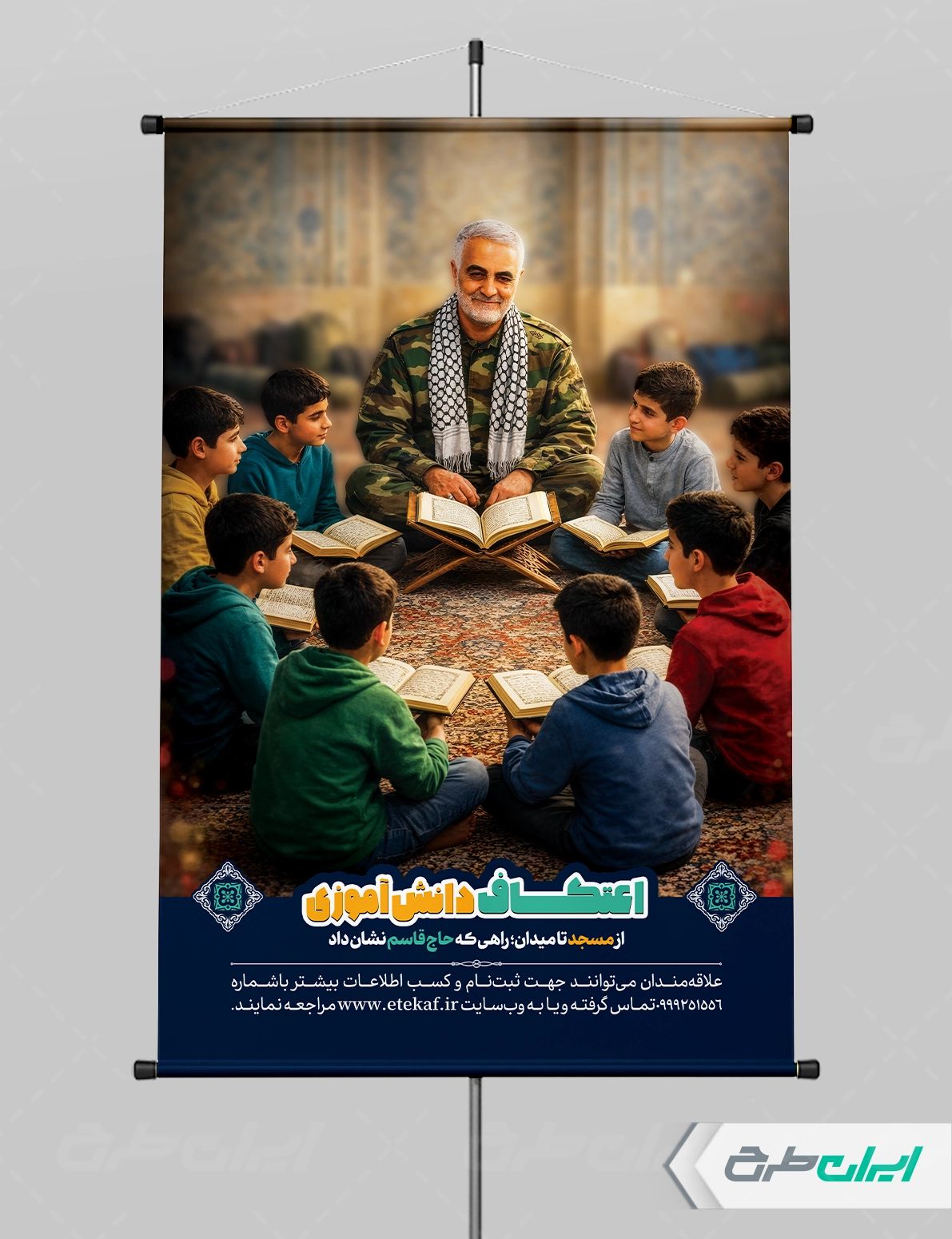 - طراحی بنر با استفاده از تصویر شهید سردار قاسم سلیمانی در طرح بنر مراسم اعتکاف
