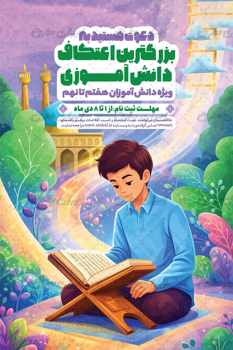 تصویر دانش آموز و متن مرتبط با بنر اطلاع رسانی مراسم اعتکاف می باشد که توسط تیم ایران طرح طراحی شده است.