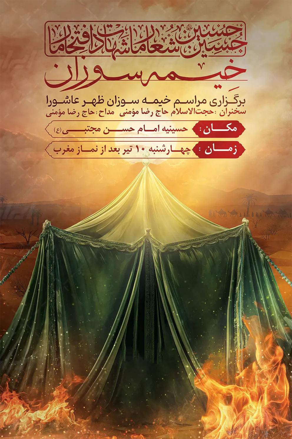 تصویر خیمه و متن مرتبط با مراسم خیمه سوزان می باشد که توسط طراحان ایران طرح در نرم افزار فتوشاپ طراحی شده است.